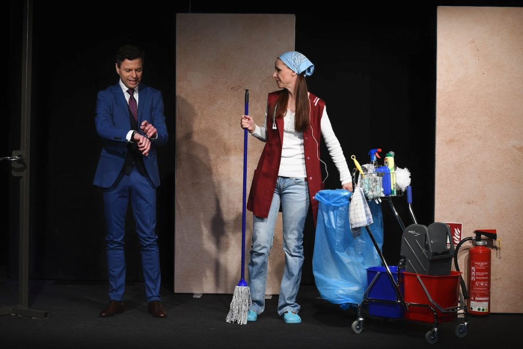 Bei dieser ungewöhnlichen und pointenreichen Begegnung werden nicht nur einige Machenschaften in der Firma aufgedeckt und in Frage gestellt, auch das scheinbar saubere Privatleben von Herrn Direktor Fröstl wird durch die allwissende Putzfrau ordentlich durcheinander gebracht.